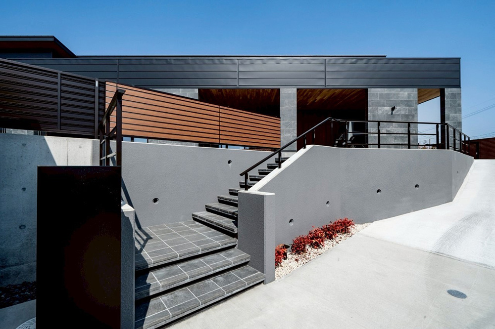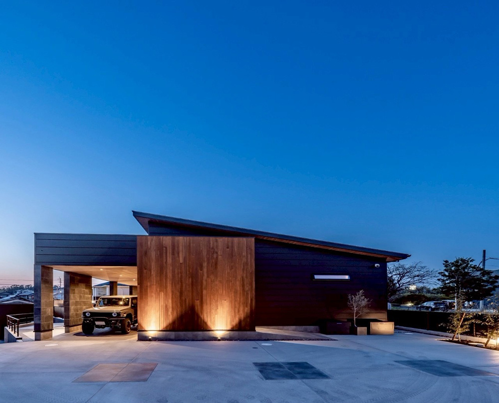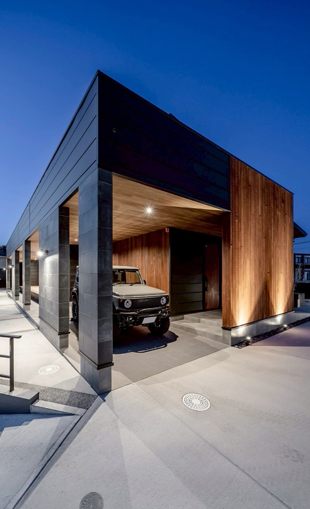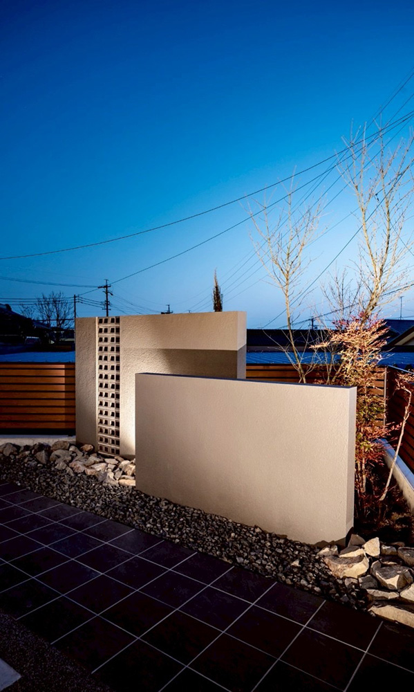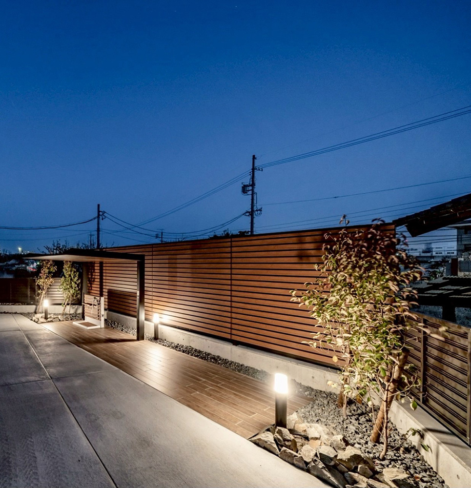 黒とグレーを基調に、木のあたたかみを添えた外観は、シンプルでありながら上質な存在感を放ちます。夜には柔らかな光が、木や石の風合いをさりげなく照らし、昼夜で異なる表情を魅せてくれます。