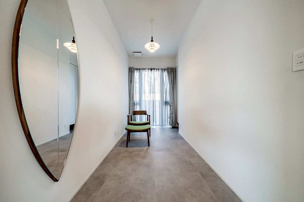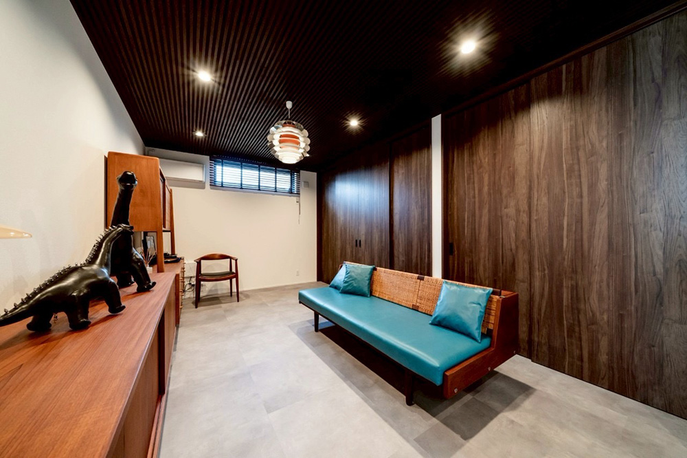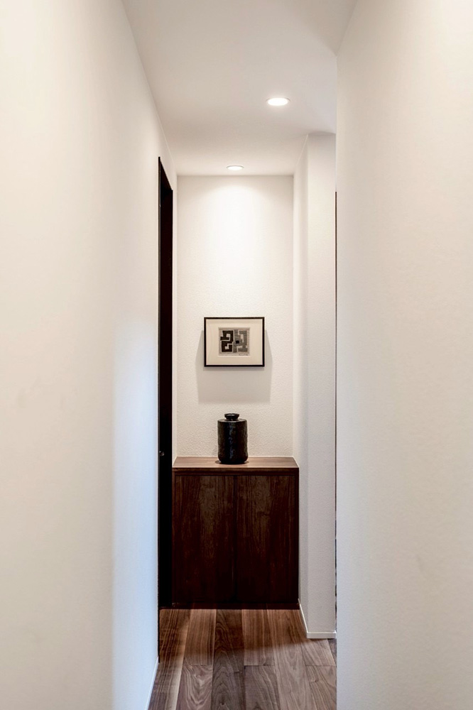 内装は、飾られたアート作品が引き立つよう、壁の強度や照明に至るまで丁寧に設計。まるでギャラリーのように、作品の魅力を自然と引き立てます。大きな窓を通して外と繋がる開放感あふれるリビングは、静かで心地よい時間が流れるくつろぎの空間です。
