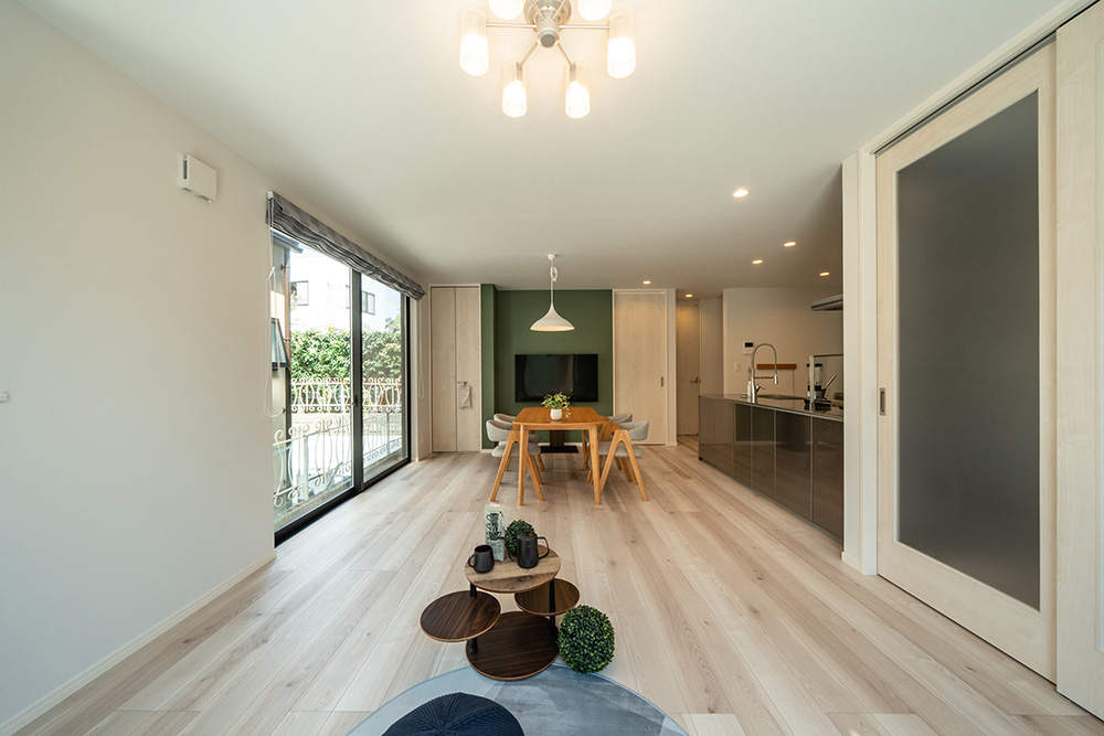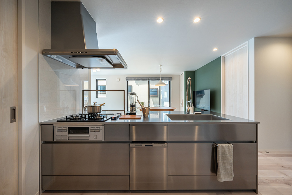 カラーコーディネートが映えるリビングは、クールなステンレスキッチンが空間をすっきりと引き締めます。