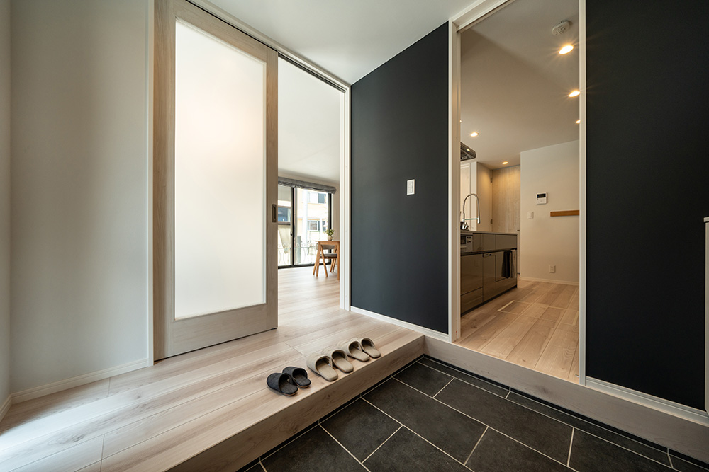広々とした玄関からは、リビングとキッチンの両方にアクセスでき、毎日の動きがスムーズに。