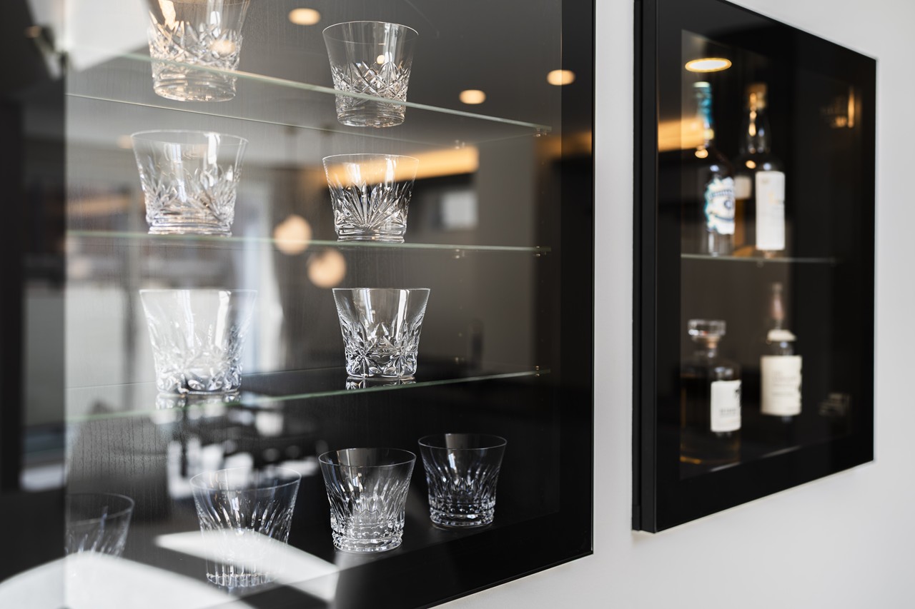 グラスやボトルが映えるディスプレイを備え、暮らしにさりげない贅沢もプラス。