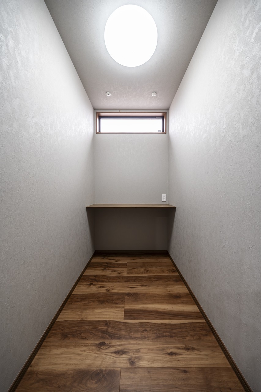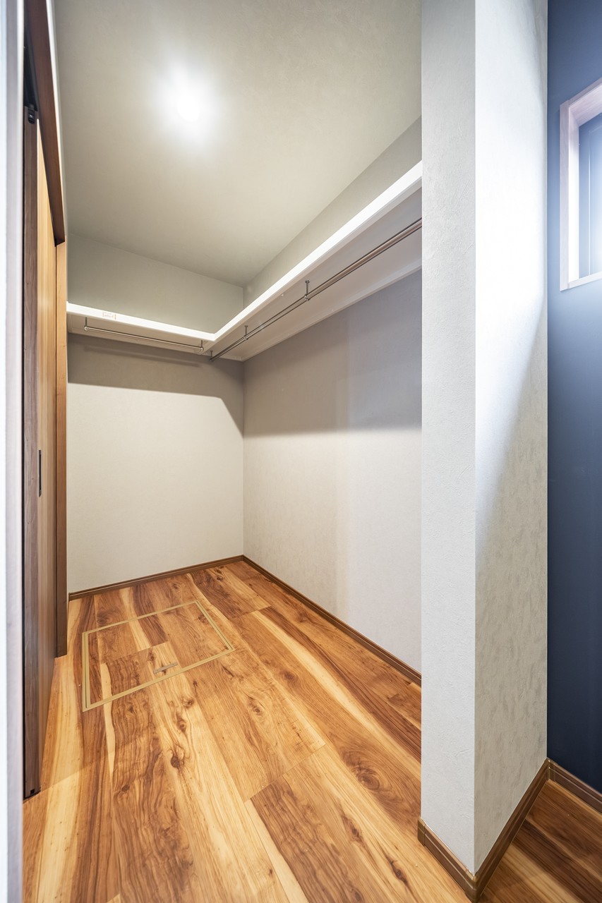 1階のウォークインクローゼットは、ホールと居室の両方からアクセス可能。使いやすさ抜群。 1階のウォークインクローゼットは、ホールと居室の両方からアクセス可能。使いやすさ抜群。