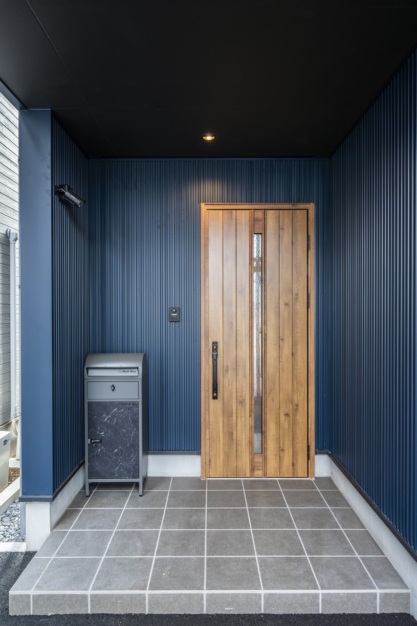 ミッドナイトブルーの外壁が映える、凛とした佇まいのガレージハウス。