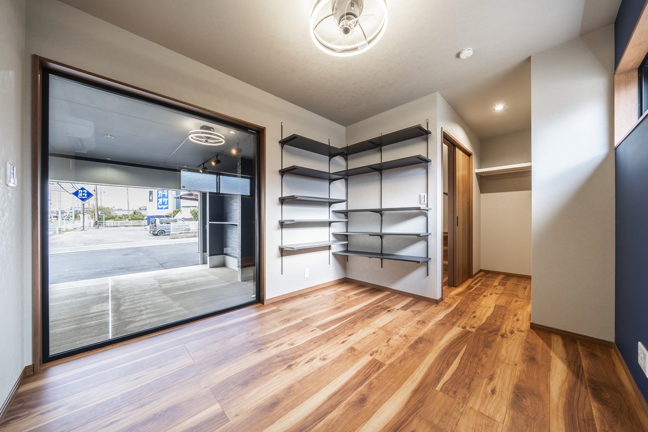ガレージからは玄関へ直接アクセス可能。その先の洋室からはガレージを望むことができ、愛車や趣味の道具を眺めながらゆったり過ごせます。