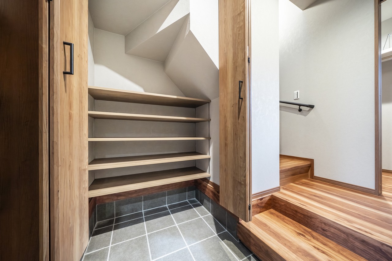 階段下を活用した玄関収納で、玄関をすっきり演出。毎日の掃除も手間なく。 階段下を活用した玄関収納で、玄関をすっきり演出。毎日の掃除も手間なく。