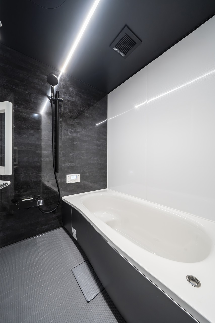 細部までブラックでそろえたスタイリッシュな浴室。一筋のフラットライン照明が空間を美しく際立たせます。 細部までブラックでそろえたスタイリッシュな浴室。一筋のフラットライン照明が空間を美しく際立たせます。