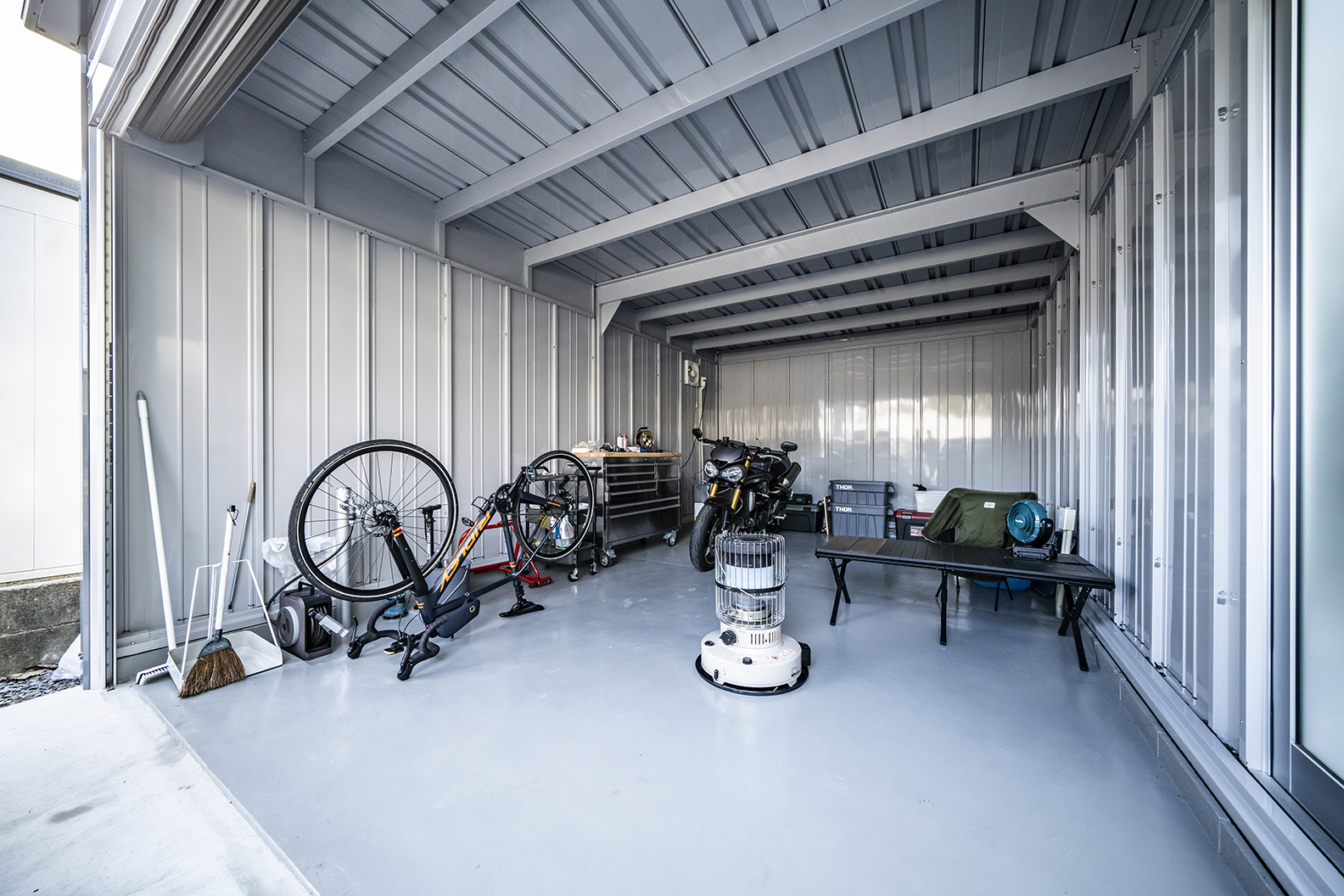 ご主人待望のガレージはバイクのメンテナンスに打ち込める十分な広さ